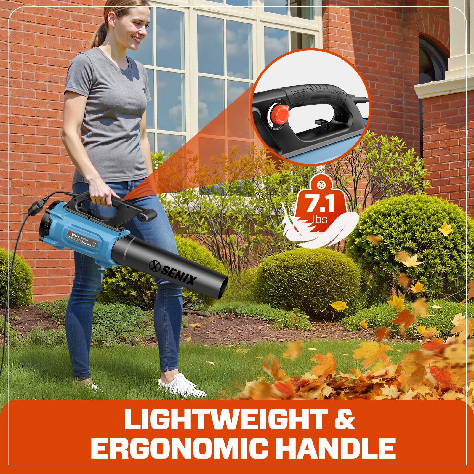 The SENIX BLAE12-M corded blower features a 12 amp motor which provides a powerful and efficient blowing performance. This blower produces airflow up to 115 MPH/at 690 CFM for fast and easy cleanup of leaves and debris from driveways, sidewalks, decks and garages. It also features built in cord retention preventing frustrating interruptions during cleanup. This unit is lightweight at only 6.8 lbs. for easy one-hand use. All SENIX corded handheld products are backed by our 2-year limited warranty for your peace of mind.
