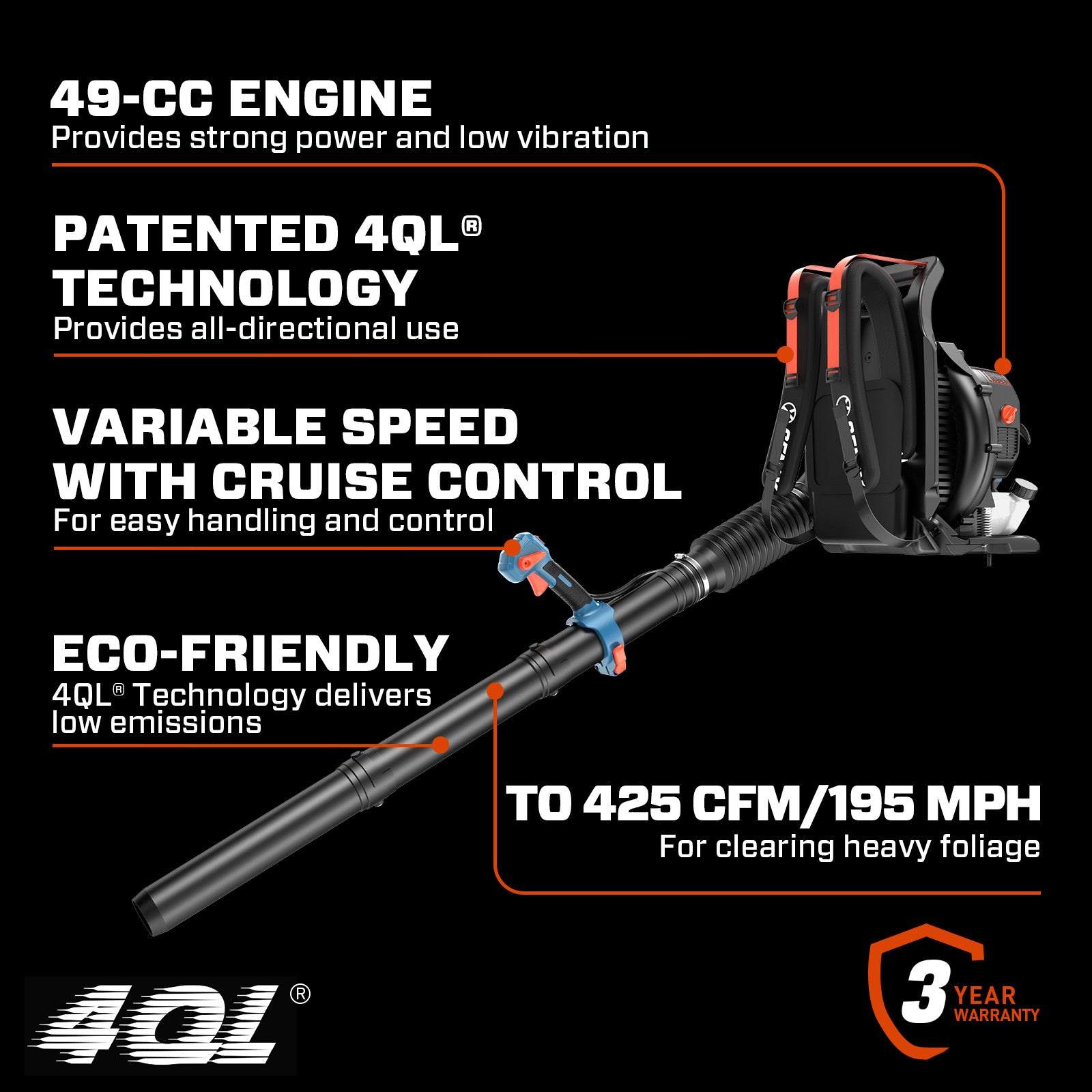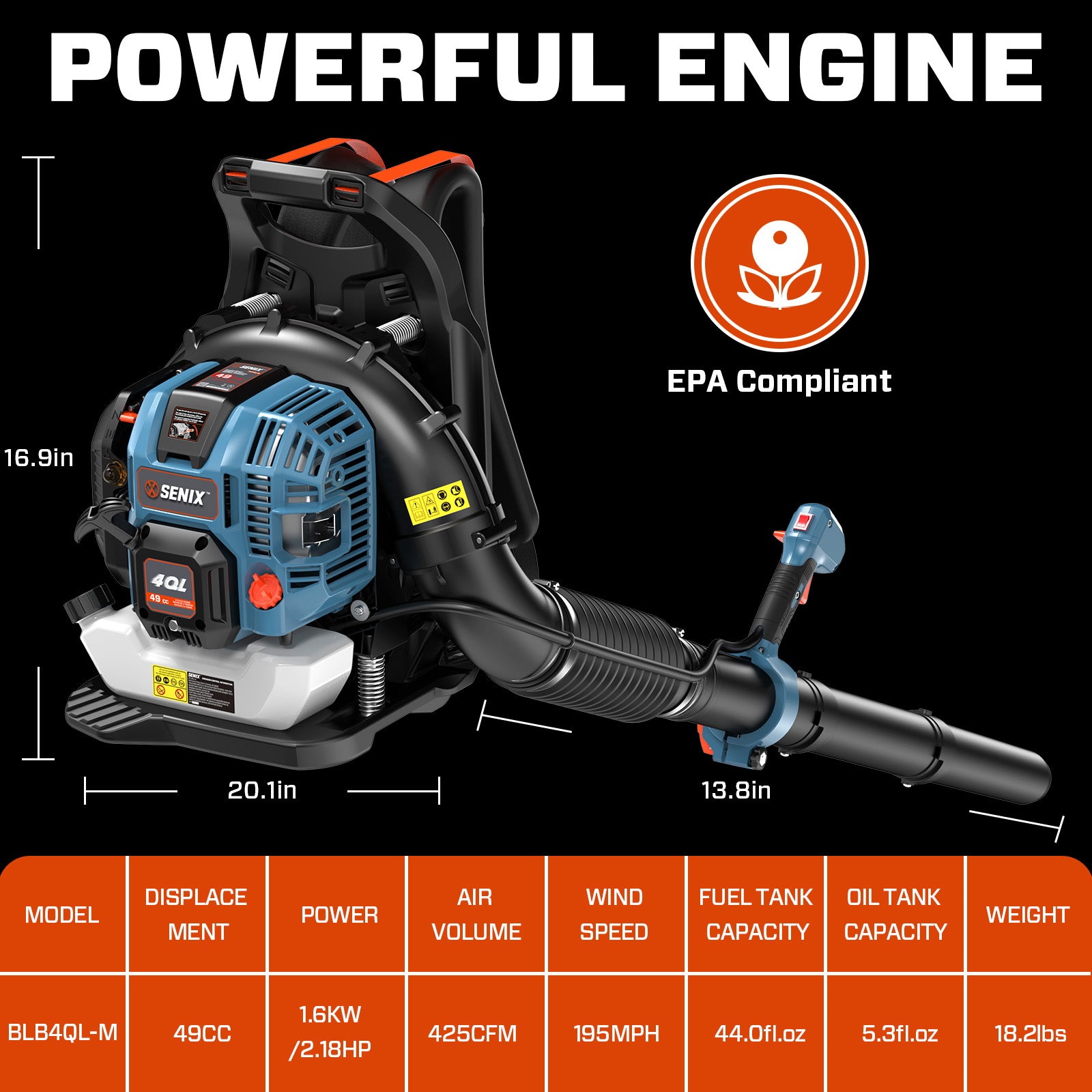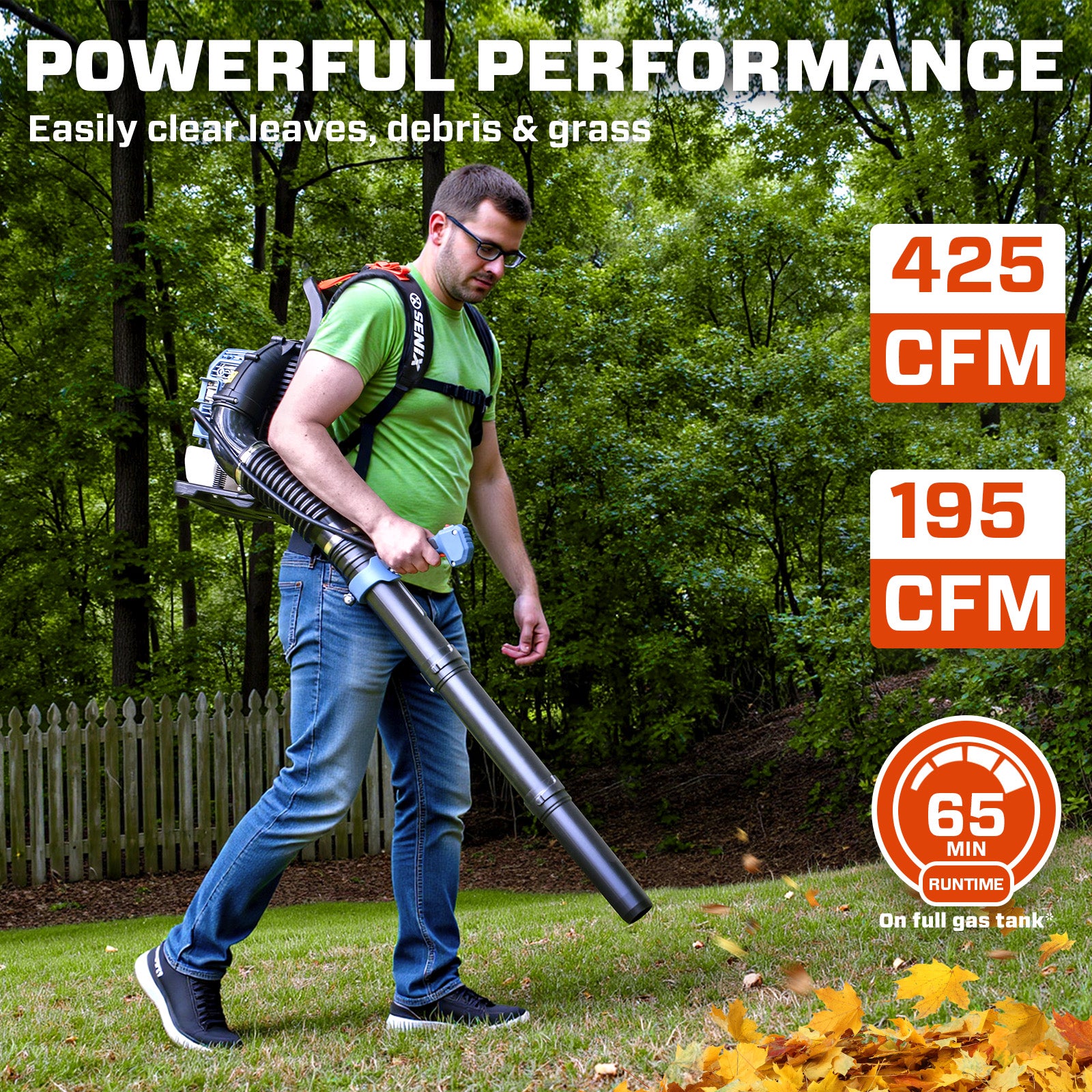 Power meets comfort. The SENIX 4QL® 49cc 4-Cycle Gas Powered Backpack Leaf Blower (BLB4QL-M) is a serious tool for serious yard cleanup. Built with a 49cc 4-cycle engine, it cranks out a monster 600 CFM and 200 MPH of leaf-blasting airflow — enough to launch wet leaves, stubborn grass clippings, and even light snow across the yard. And forget the mess and hassle of mixing oil and gas. The 4QL® 4-cycle engine runs cleaner, smoother, and more efficiently than 2-stroke engines, with lower emissions and less noise. Whether you’re a homeowner with half an acre of leaves or a small biz keeping walkways clean year-round, this backpack blower is built for comfort, power, and all-day performance — with a variable-speed throttle and cruise control to keep your hand from falling off halfway through the job. The SENIX BLB4QL-M Gas Powered Backpack Leaf Blower delivers pro-grade power in a clean, fuel-efficient package that makes yard cleanup faster, easier, and way more satisfying. All SENIX 4QL gas powered leaf blowers are backed by our 3-year limited warranty for your peace of mind.