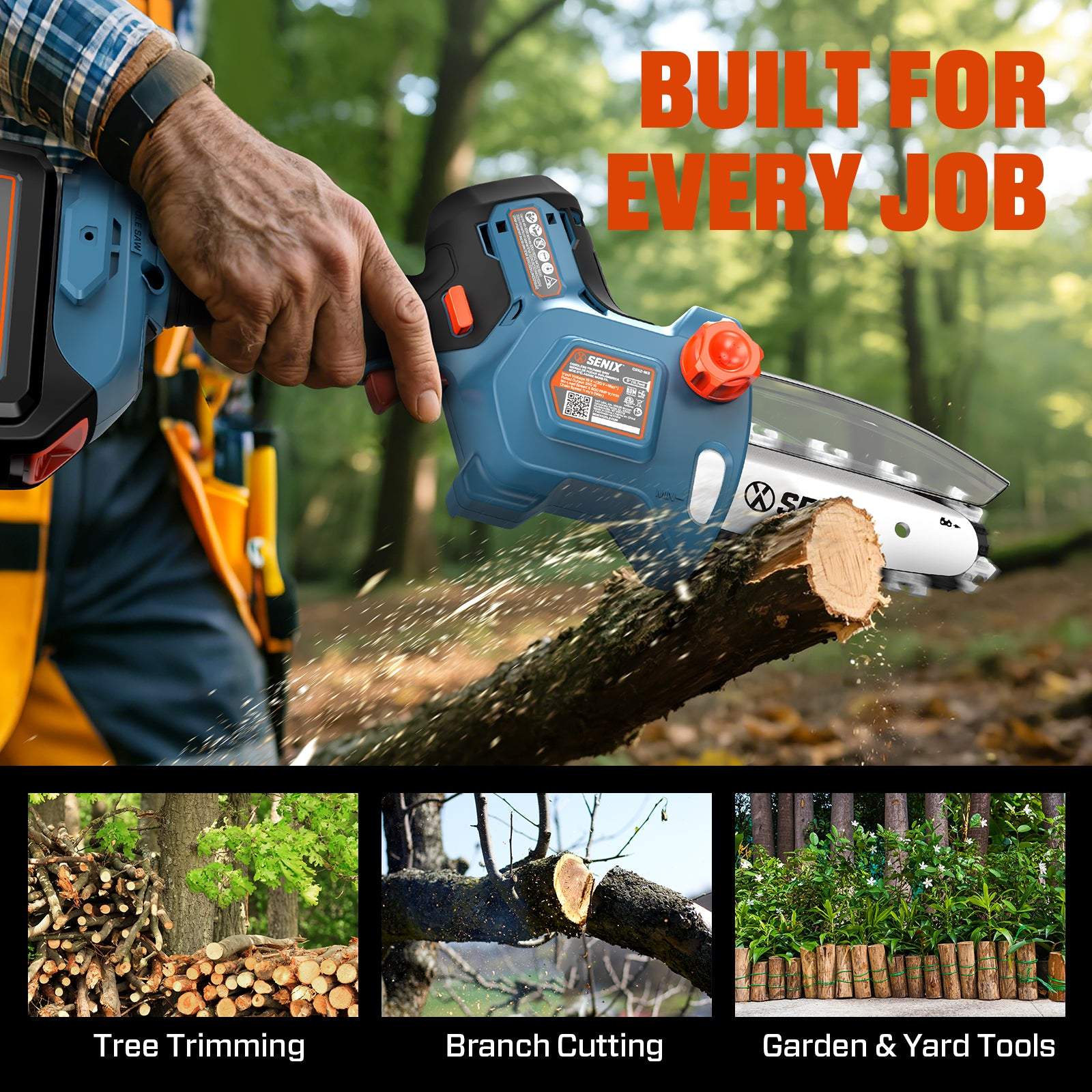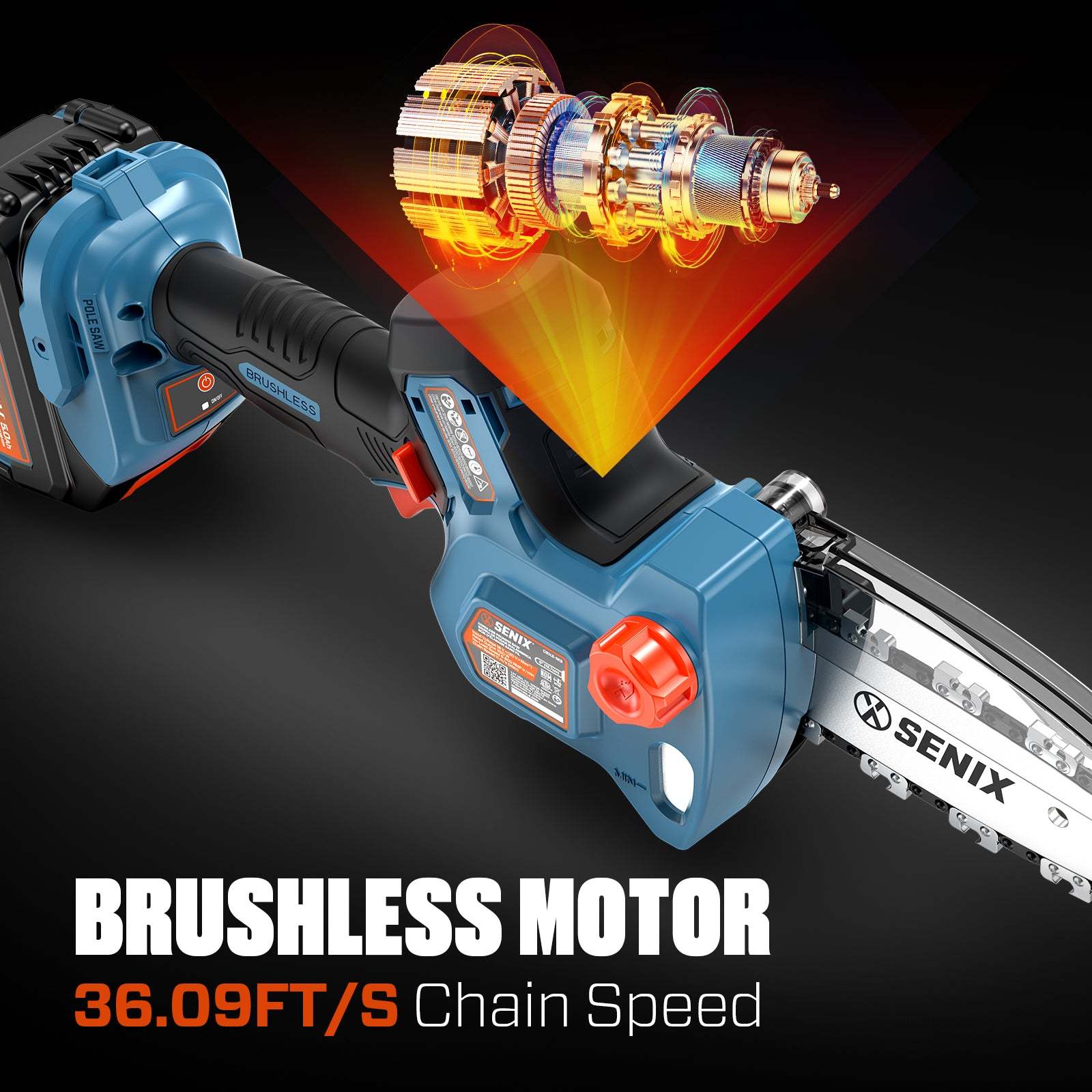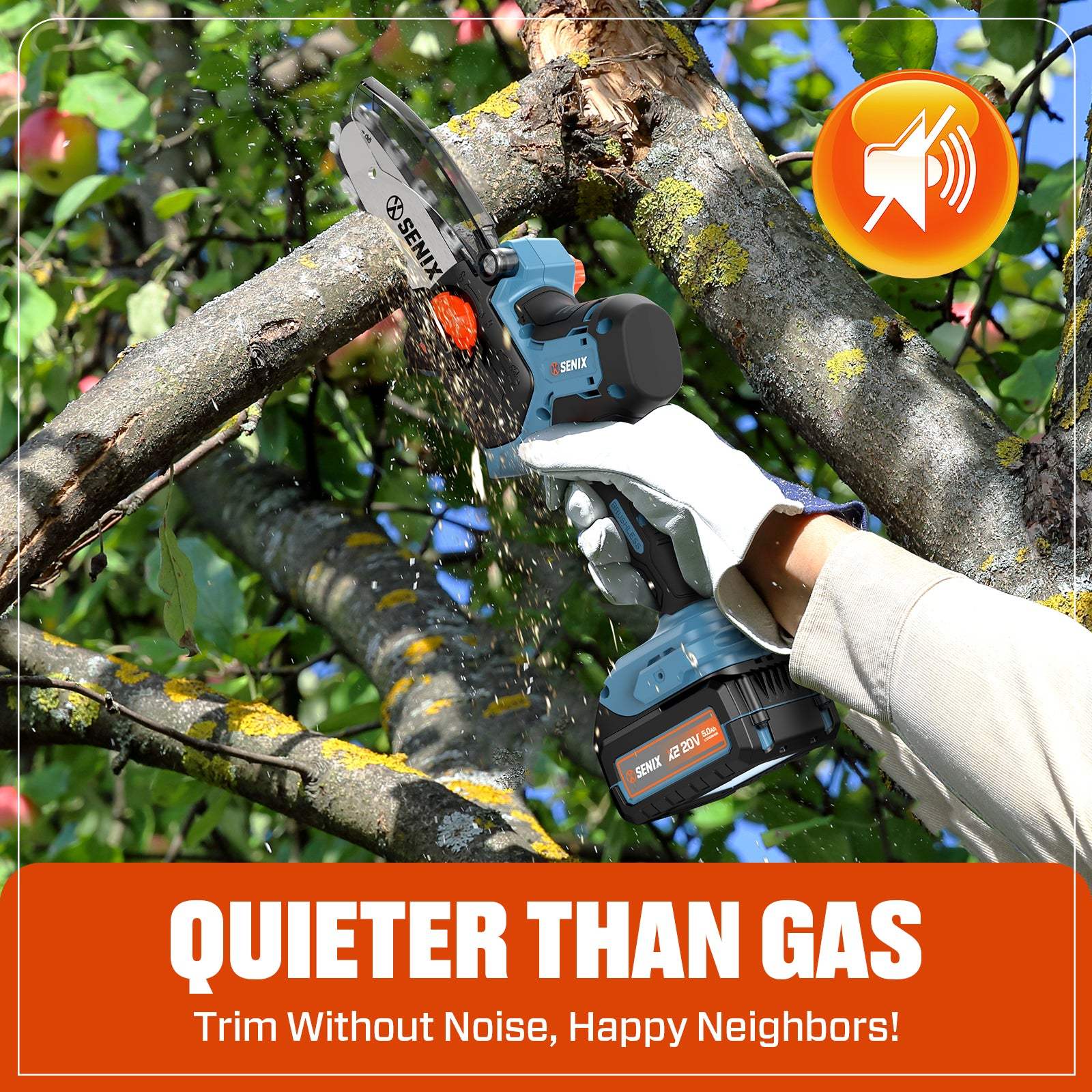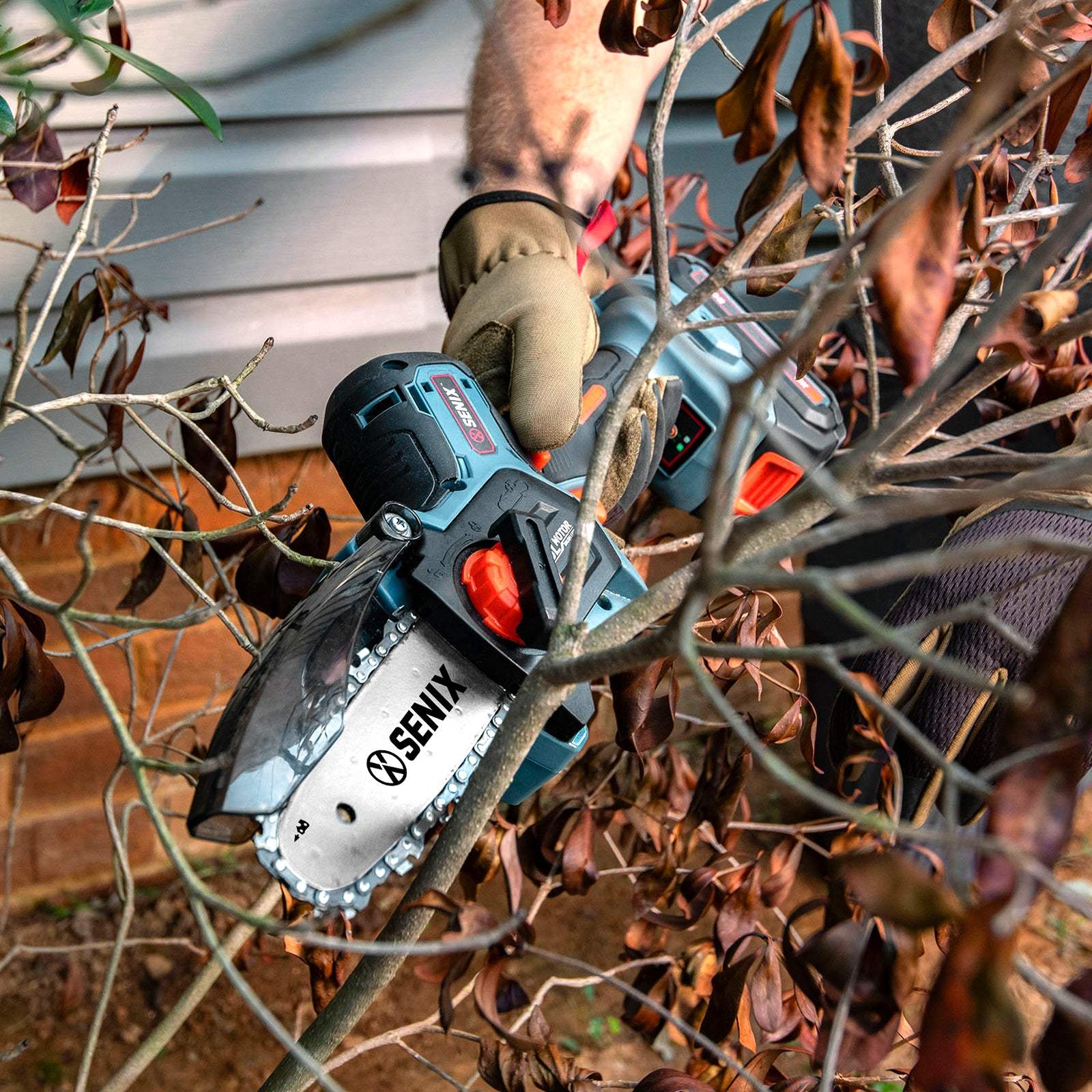 Meet the SENIX X2 20V 5" Mini Cordless Chainsaw, your new go-to for all your wood cutting and gardening needs. With a blazing 11m/s chain speed, it makes quick work of tree branches and pruning tasks, effortlessly cutting up to 4.7" in a single go. Its lightweight design means you can easily handle and carry it around, making your job that much easier. Plus, the brushless motor ensures you get maximum power, longer runtime, and extended motor life. Whether you're a gardening enthusiast or just need to tidy up the yard, this easy-to-use tool has got you covered.