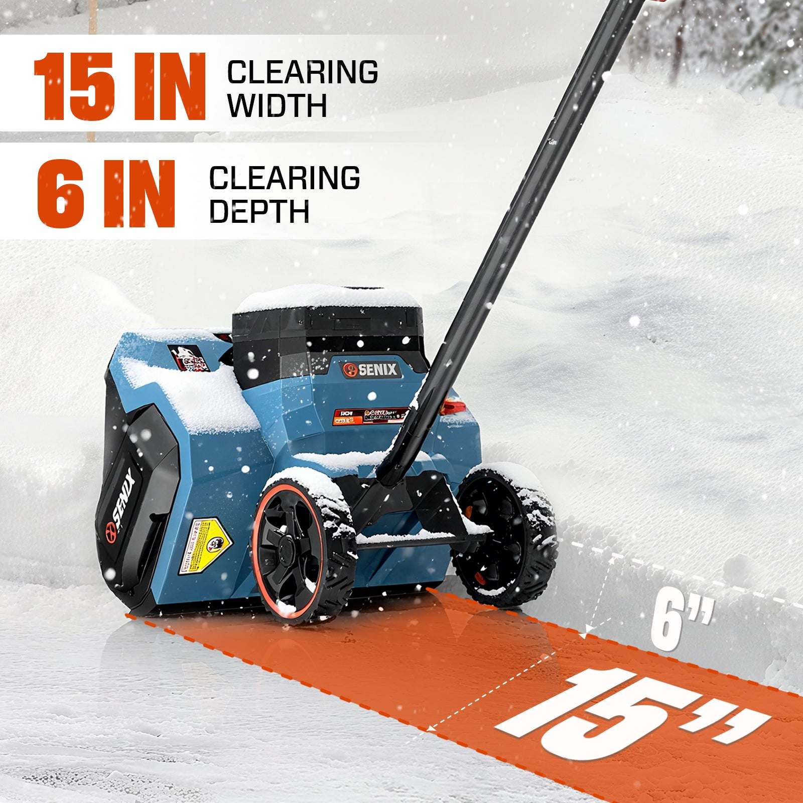 The SENIX X6 60V Max* 15" Brushless Cordless Snow Shovel combines power, control, and convenience to help you conquer winter with ease. Fueled by the X6 HYPERCORE™ battery system, this high-performance tool delivers up to 600 lbs/min of snow-clearing force and throws snow up to 30 feet, all while operating efficiently with intelligent power management that extends runtime and battery life. The 15-inch clearing width makes it ideal for decks, sidewalks, and small to mid-sized driveways, while the adjustable louver lets you direct snow placement on the fly. With two auger speeds, you can toggle between max power for heavy snow or longer runtime for light conditions. Designed for comfort and control, it features an ergonomic handle, adjustable shaft, and built-in wheels for smooth maneuvering. An integrated LED light improves visibility in low-light conditions, and the shovel is fully compatible with the SENIX X6 60V battery platform, making it a smart addition to your outdoor power tool lineup. Backed by a 5-year limited tool warranty and 3-year battery and charger warranty, this cordless snow shovel is built to perform and made to last.