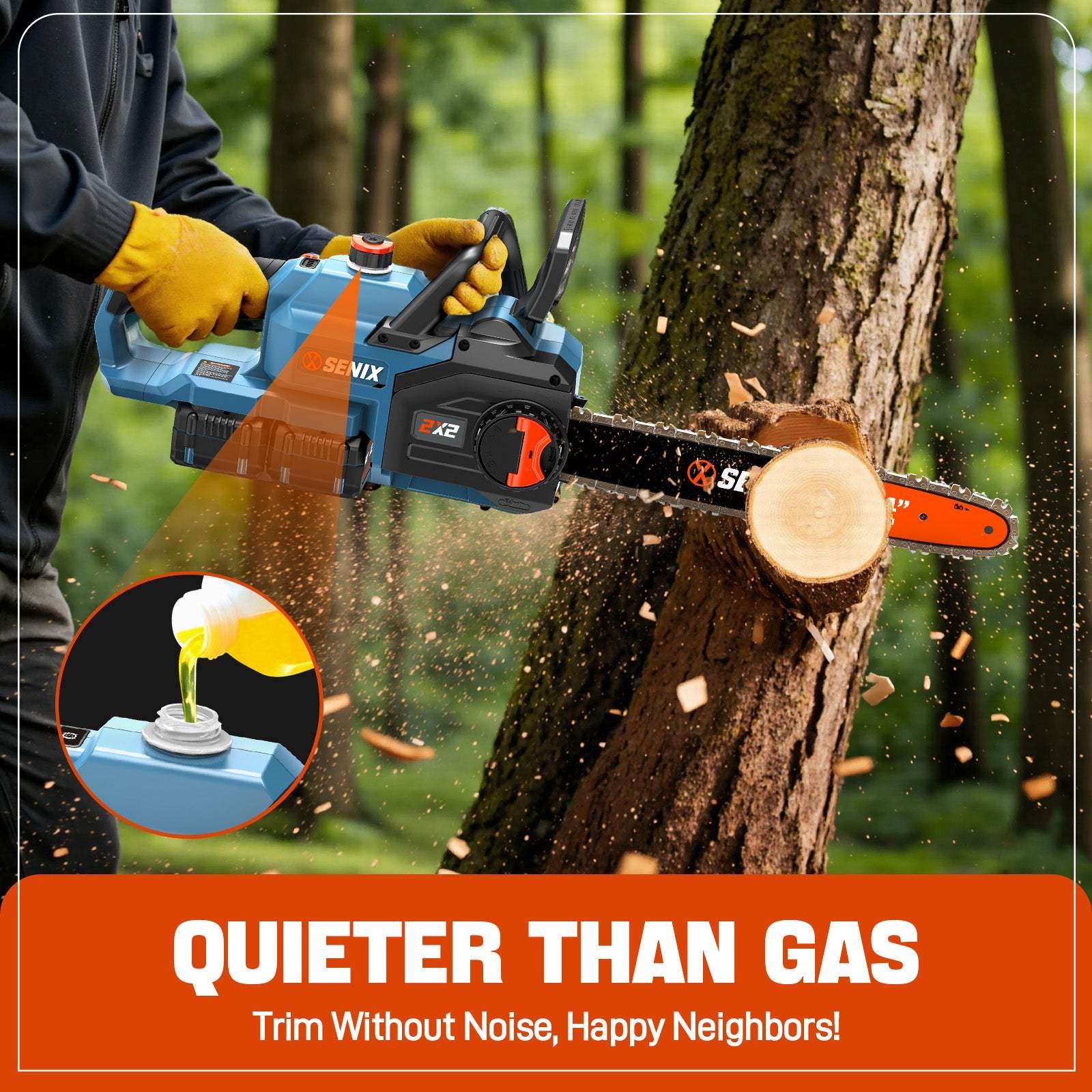 Experience the perfect blend of power, precision, and convenience with the SENIX 40V 2X2 14" Cordless Chainsaw. Designed for maximum productivity, this high-performance chainsaw is perfect for trimming branches, cutting firewood, and tackling small to medium-sized jobs. Powered by dual 20V batteries, it offers gas-like performance without the noise, emissions, or maintenance hassles. The SENIX 40V 2X2 14" Cordless Chainsaw is the perfect tool for homeowners and professionals seeking superior cutting power with the ease of cordless technology. With its high-performance features like the brushless motor, tool-free tensioning, and automatic chain lubrication, it’s built to handle tough tasks while keeping safety and ease of use a top priority.
