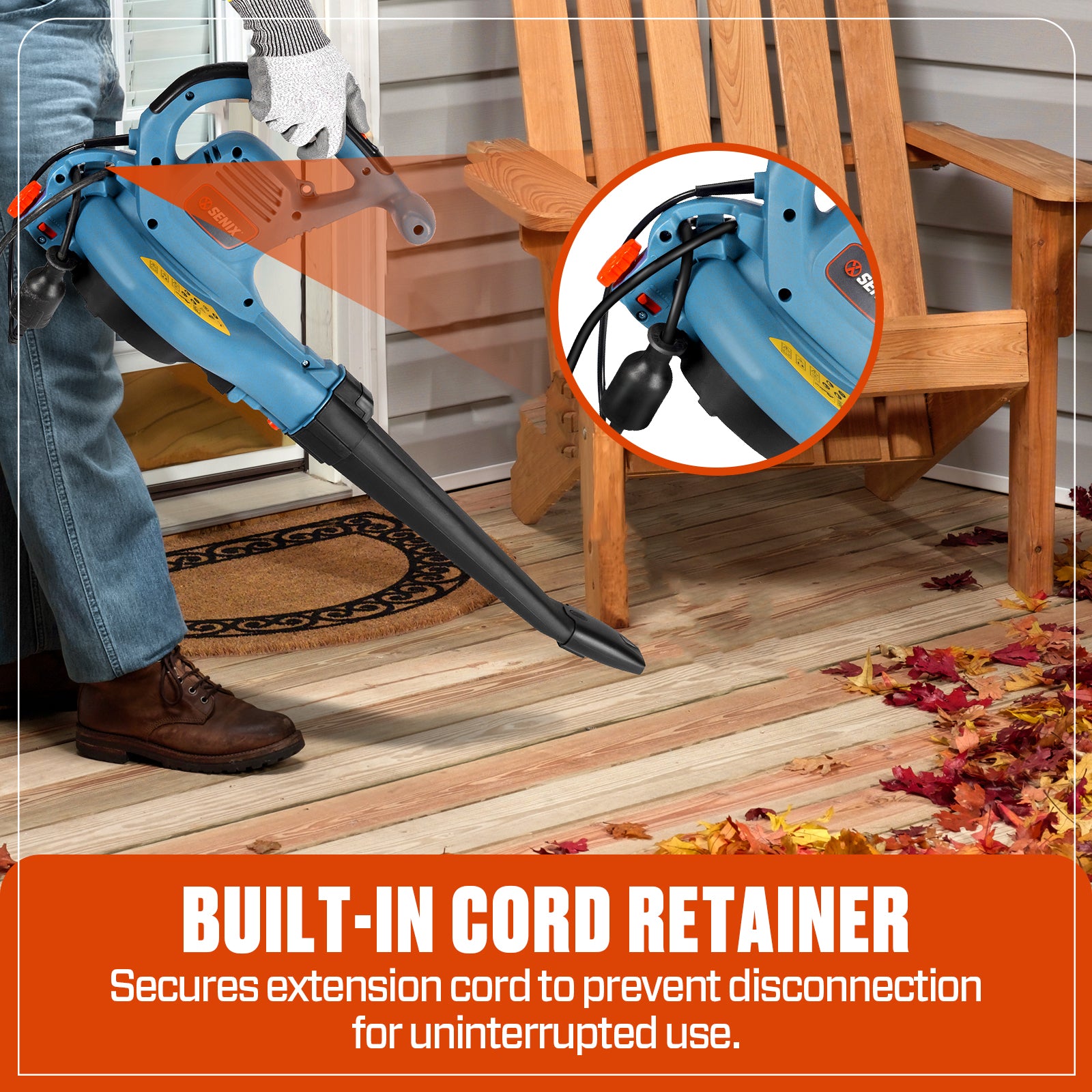 The SENIX BLVE12-M corded blower/vac features a 12 amp motor which provides a powerful and efficient blowing and vacuuming performance. This blower produces airflow up to 179 MPH/at 420 CFM for fast and easy cleanup of leaves and debris. It also features built-in cord retention preventing frustrating interruptions during cleanup. This unit is lightweight at only 8.2 lbs. for easy one hand use. All SENIX corded handheld products are backed by our 3-year limited warranty for your peace of mind.